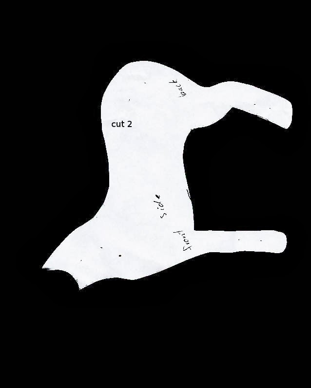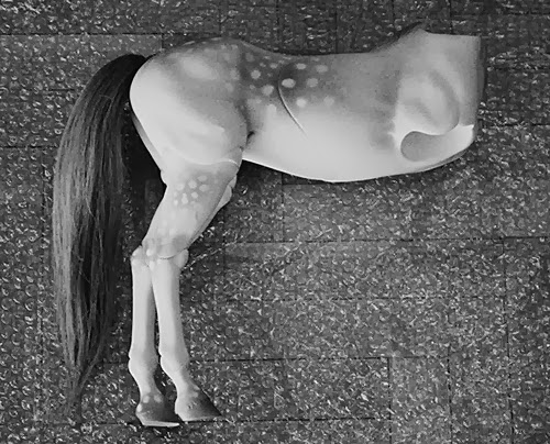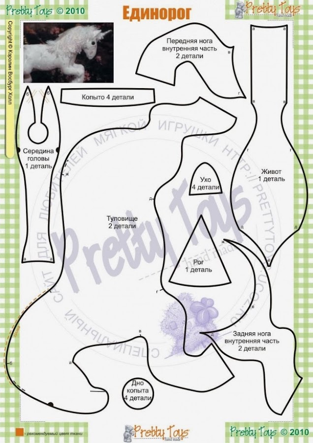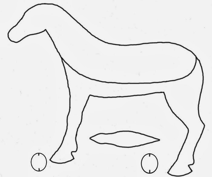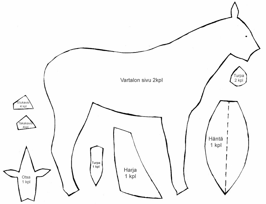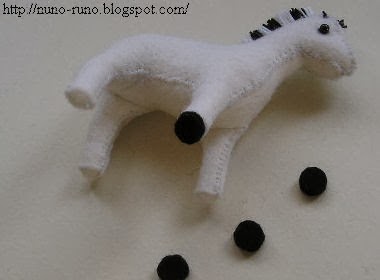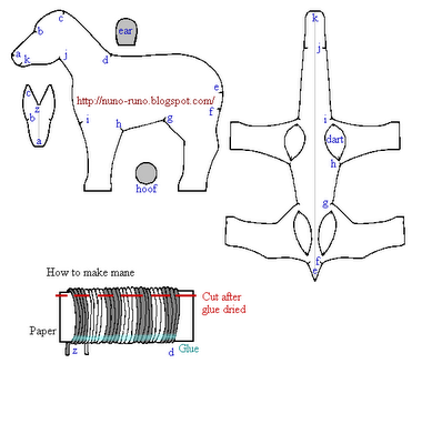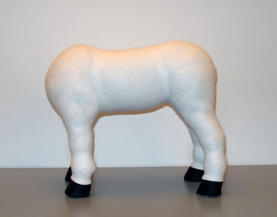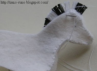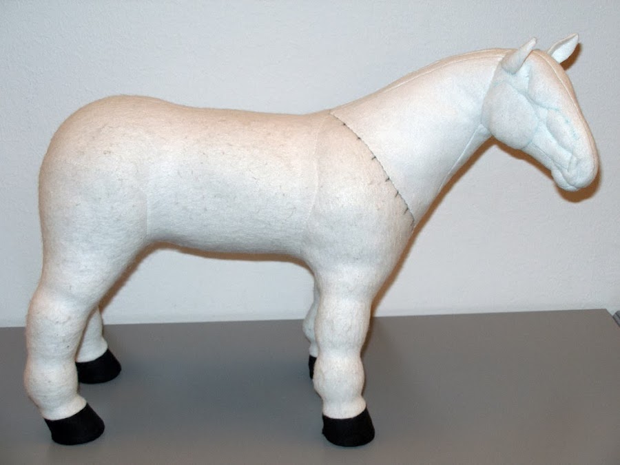 Va como el de la jirafa: Se cosen entre sí las pinzas,del patrón del vientre con patas y cuando esté hecho esto,se cose a ambas partes laterales bajas del cuerpo.Coser las partes superiores del cuerpo,menos por el cuello trasero, (donde primero implantaremos las crines,cortando si sobra y luego cosemos,como en la jirafa) y la parte trasera por donde rellenaremos después.