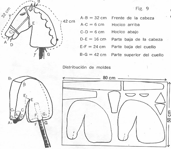 Luego se cosen todas las líneas hilvanadas con dos costuras muy juntas. Al planchar las costuras conviene colocar debajo un lienzo arrollado. Se da vuelta el trabajo y se rellena; se introduce el palo y se clava. Se cosen ojos y orejas, y se aplica el cabestro.