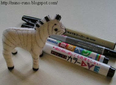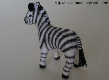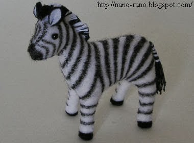 Cebra con la piel pintada a mano con un rotulador ( lo suyo es comprar la piel de peluche exacta) . Tiene 7 centímetros de alzada. Consulte el apartado de " jirafa" sobre la elaboración de las costuras de las orejas, la cola, cascos y crines.