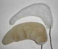 Se puede hacer en fieltro o paño rojo, para el cuerpo y cabeza, y marrón o rojo más oscuro que el del cuerpo para el resto de las piezas, el fondo del ojo en blanco y la niña en negro.
