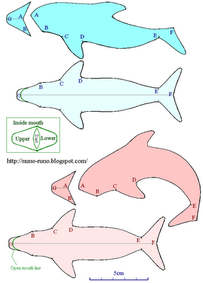 Es simple y fácil. corte. Cosa la parte de atrás con la puntada de manta. Coser la mandíbula superior de la cara. Coser el vientre para el cuerpo. Relleno de fibra de poliéster de cosas en el mismo. Pegue los ojos. Los ojos son pequeños círculos de cuero. Usted puede utilizar cuentas. la boca abierta del delfín. Su mandíbula inferior es más corto (utilizar la línea verde del patrón). Coser el dardo de la boca por dentro. Luego, coser la boca interior para el exterior. delfines saltando. bebé delfín. He impreso el patrón en el 50% de su tamaño. Patrón.