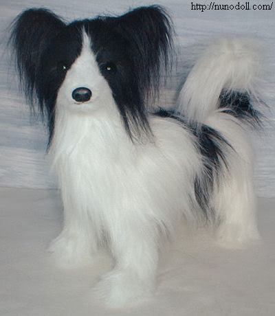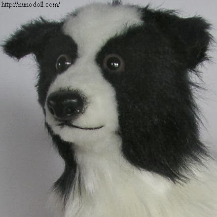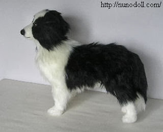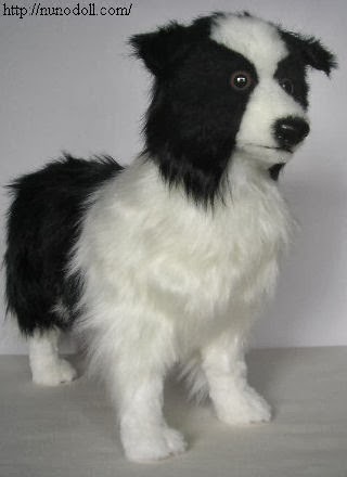 Perro de pastoreo, este border collie tiene el pelaje blanco y negro.Mide 29 centímetros (de pie hasta la cabeza).Ojos marrones de plástico. Alambres en las extremidades. El cuello se vuelve con la articulación. El pelaje del final de la cola es blanco.