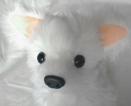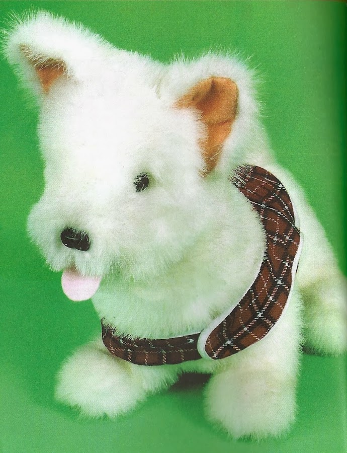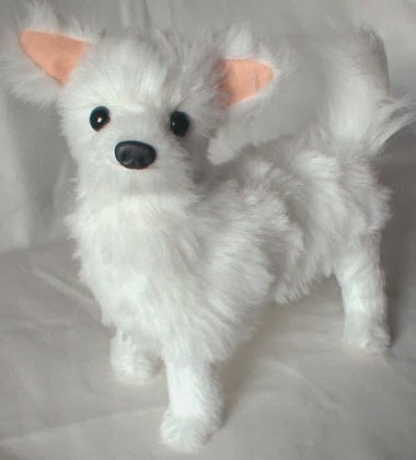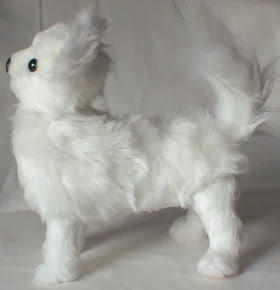 Perro de peluche de tamaño pequeño, este Chihuahua es de pelo largo . Mide 22 cm .Pelaje blanco, ojos de vidrio y nariz de arcilla .Tiene cables en las piernas y la cola.