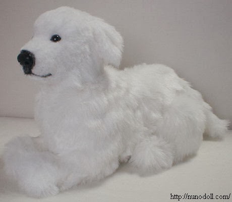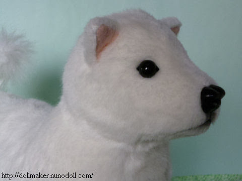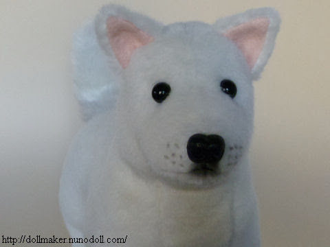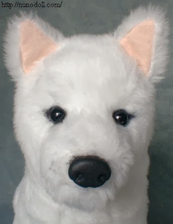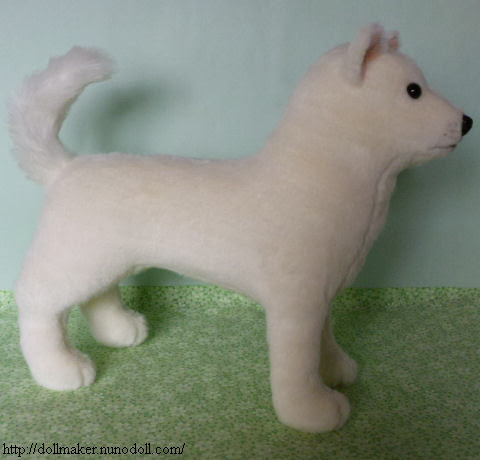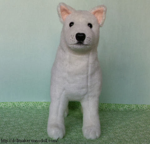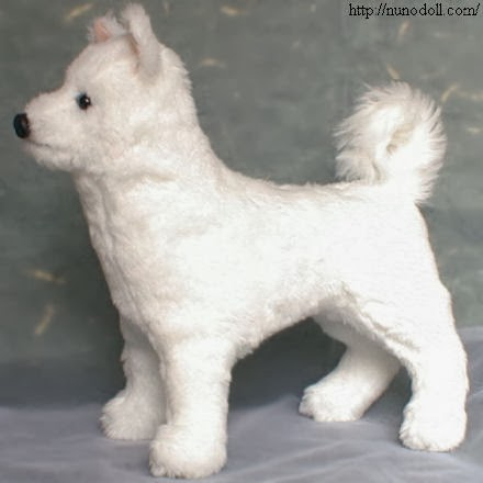 Este perro japonés es valiente y fuerte. Este peluche es un perro blanco Kishu, cuya cola se enrolla, y las orejas son triangulares.Mide 28 centímetros (desde el pie a la cabeza).