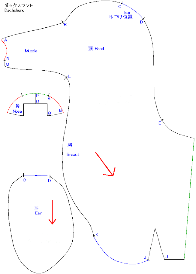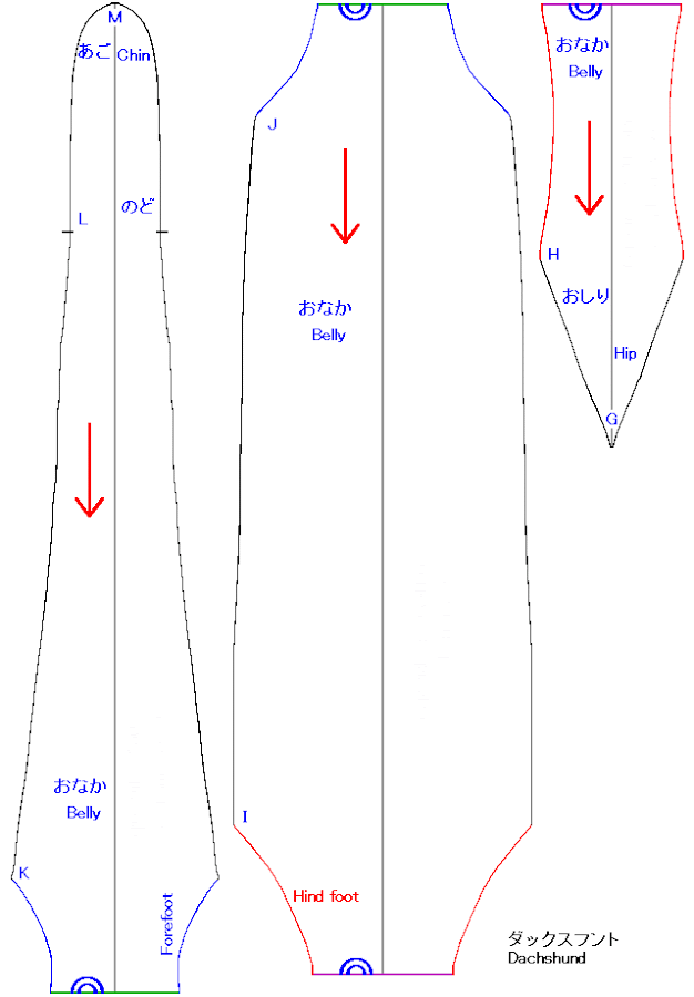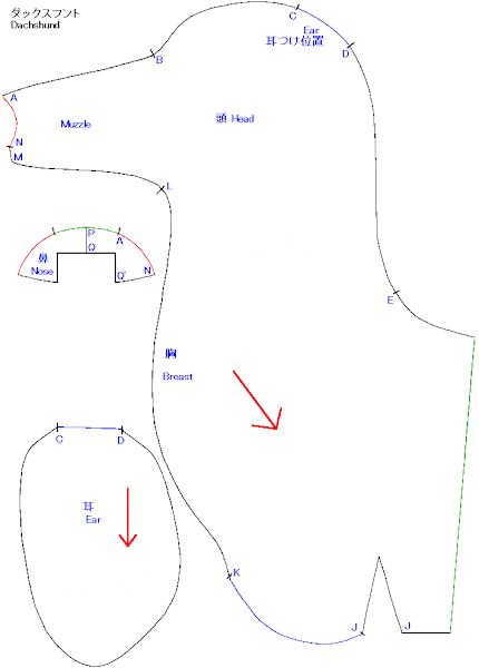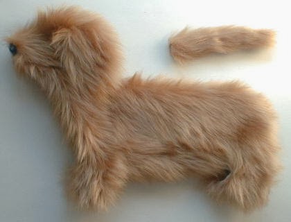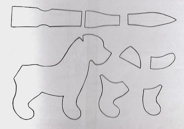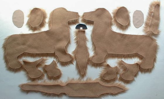 Hay 14 piezas para hacer el Dachshund. Preste atención a la dirección del pelo cuando corte y vaya a coser,no vaya a ser que la dirección del pelo en una parte,sea la contraria a la de la parte siguiente y nos quede hecho una chapuza.Se requiere como mínimo,el margen de costura de 5 milímetros.