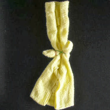 - Ahora haremos las patas delanteras.Por la parte base,haremos otro pliegue y ataremos la parte enrollada.Ya tenemos una pata, haremos un tanto de lo mismo con la otra esquina,para hacer la otra pata. Las patas traseras las heremos como en la foto y de la misma forma y modo que las delanteras,dejando un poco más,para hacer el efecto de la rótula trasera y atar.
