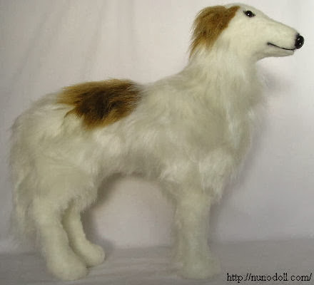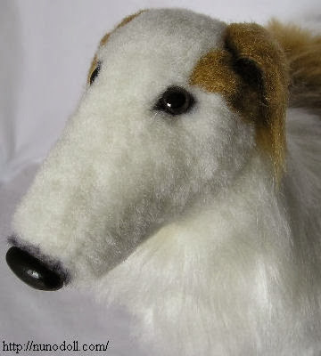El Borzoi ruso conocido como perro lobo ruso, es largo y alto. Mide 34 centímetros (desde patas delanteras a cabeza). Pelaje blanco y marrón.Con cables en las extremidades.