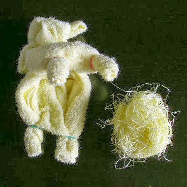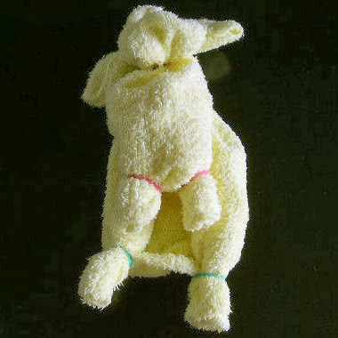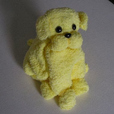 Cachorro sentado. Se hace de una toalla pequeña (de la cara), sin cortar ni coser.