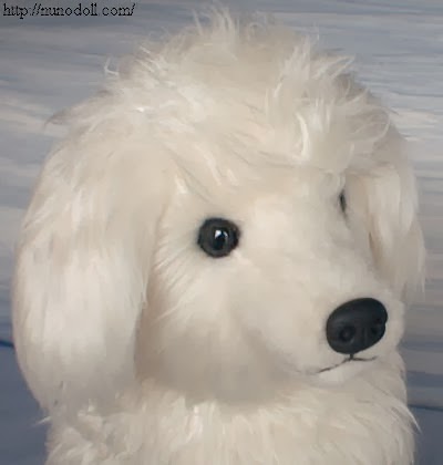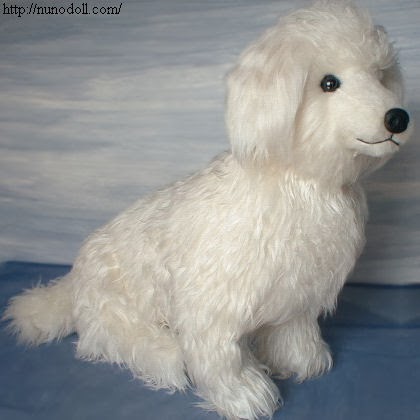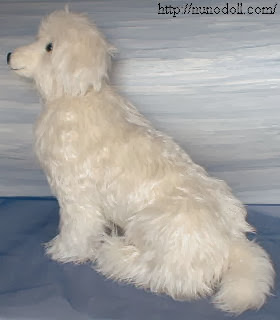 Caniche sentado con pelaje blanco.Mide 34 centímetros hasta la cabeza. 23 centímetros hasta el hombro. Los ojos son de plástico y la nariz es de arcilla. No es lavable.