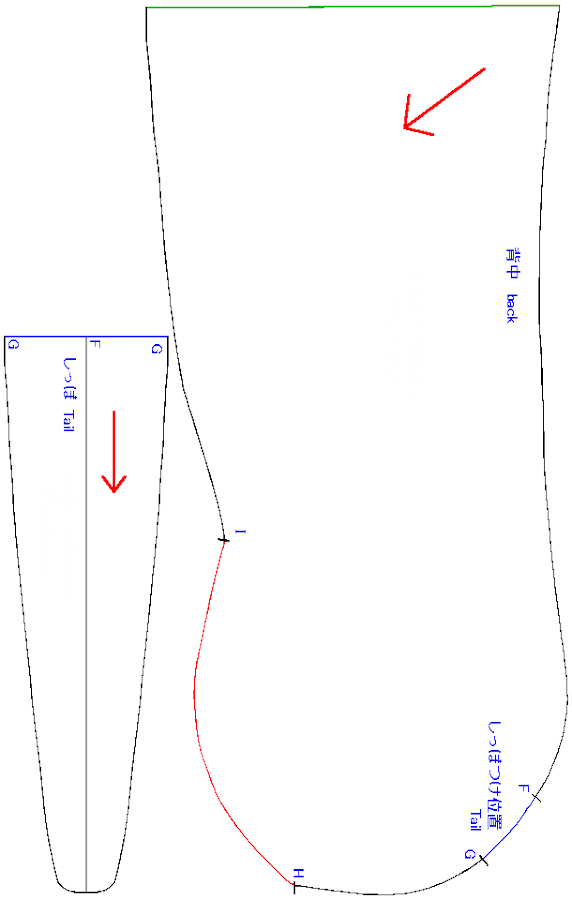 Cosa de la barbilla a la cadera (M-L-K-J-I-H-G). Dejar un sítio de apertura,(A-C).Coser la parte trasera (E-F).