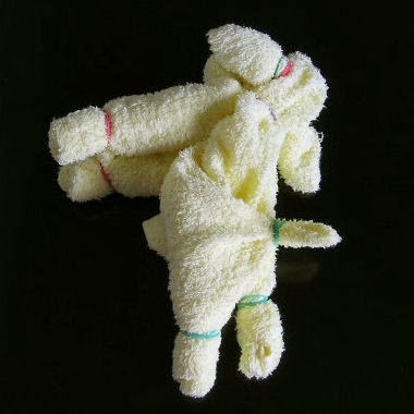 - Doblar por la mitad,lo ya plegado de la toalla y hacer un pliegue o pico en la esquina .Cerrar la base de esa esquina con una goma. Se trata de una oreja.