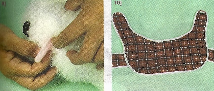 Coser las piezas del chaleco a mano o a maquina y bordear con sesgo blanco. Pegar el velcro en la parte delantera, para sacarlo fácilmente cuando desee lavarlo.