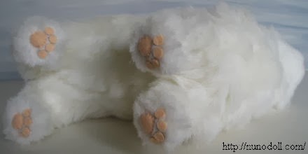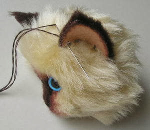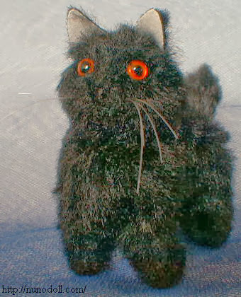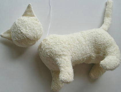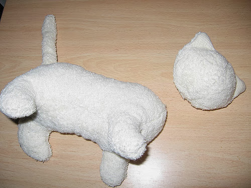 Este chico,(de donde he copiado,traducido un poco y puesto algo de mi cosecha),aconseja,antes de componer la cara del gato,el relleno del cuerpo,como así también rellenar la cabeza,una vez terminada y luego coser la cabeza al cuerpo,pero yo creo, ( al menos yo lo voy a hacer así, a ver como me sale),que es mejor coser la cabeza ( ya con ojos,etc...),al cuerpo,antes de rellenar todo, dejando una apertura,lo suficientemente grande,para rellenarlo todo de una vez,( menos las patas y rabo que ya habríamos rellenado previamente).