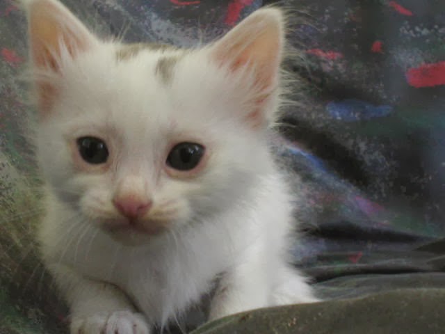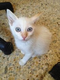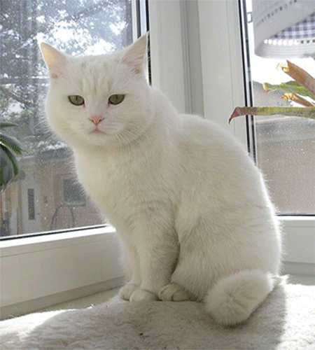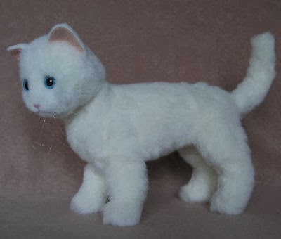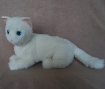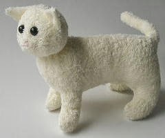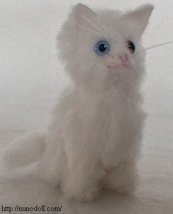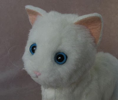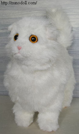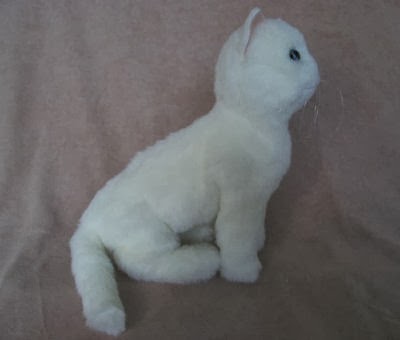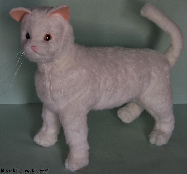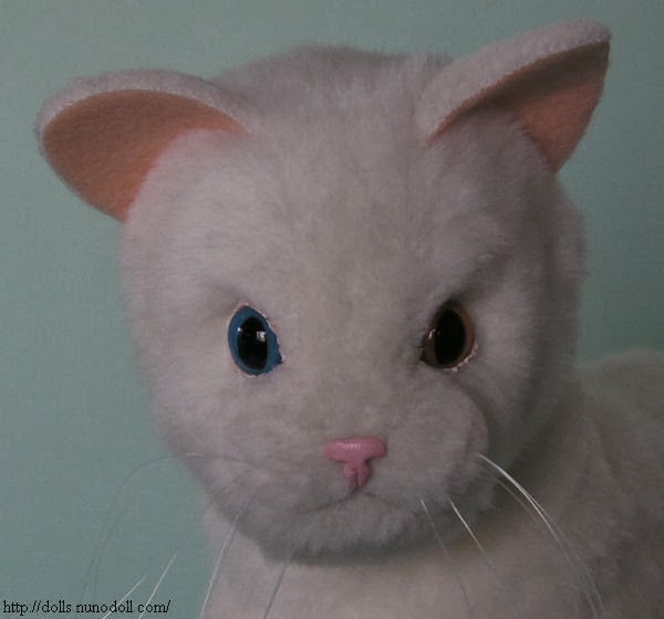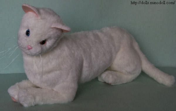 Gato blanco con ojos dispares. Los colores de los ojos son de color azul y naranja ( se les puede cambiar a otros colores). 35 cm de altura, 32 cm de longitud, y la cola es de 20 cm. ojos de plástico y bigotes de nylon , la nariz de arcilla, la piel es de fieltro y peluche. Hay articulaciones de alambre de la cabeza hasta la cola y las extremidades.