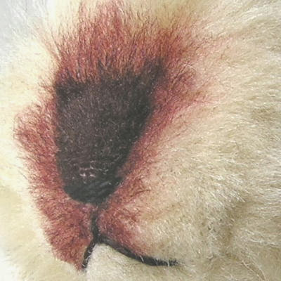 Coser la mejilla a la base del morro por el lado.aC es más largo que b-c ". Se debe de reducir el tamaño y coserlo.
