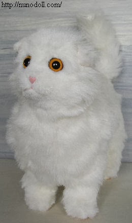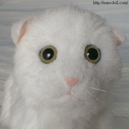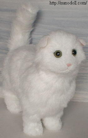 Gato único, el Scottish Fold tiene las orejas bajas y pequeñas, Las cuales,han de hacerse más pequeñas cuando hagamos el patrón y doblarlas,una vez la hayamos cosido,para que queden como en las fotos.Tiene ojos redondos de plástico y la cola grande. Medidas 26 centímetros (desde las garras hasta la parte superior de la cabeza). Hecho con tela de peluche blanco. Articulado con alambre en la cola y las patas. Fieltro en las almohadillas de las patas.