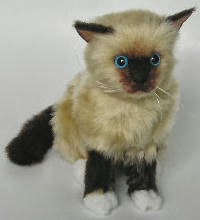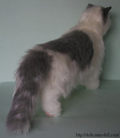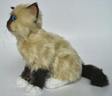 Gato de pelo largo, Ragdoll. Blue Point bicolor. 32 cm de altura, 32 cm de longitud, y la cola es de 22 cm. ojos, bigotes de plástico de nylon, la nariz es de arcilla, las almohadillas e interior de orejas son de fieltro y la piel restante es d