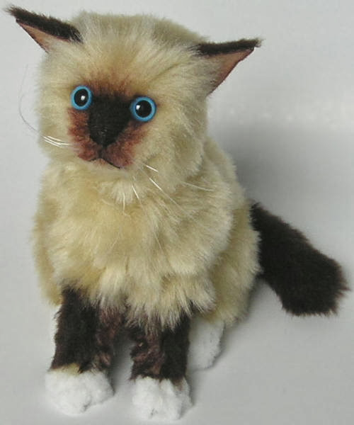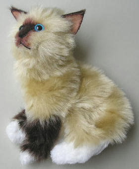 El gato Ragdoll está sentado ,naríz 3 tonos o más,más oscura que la piel, manitas blancas y ojos azules.Altura (hasta la cabeza) 20 cm.Este gatito se hizo con 3 colores de piel. Se puede hacer el manto del gato bicolor o monocolor.