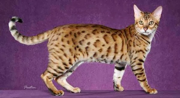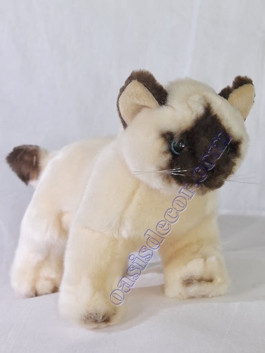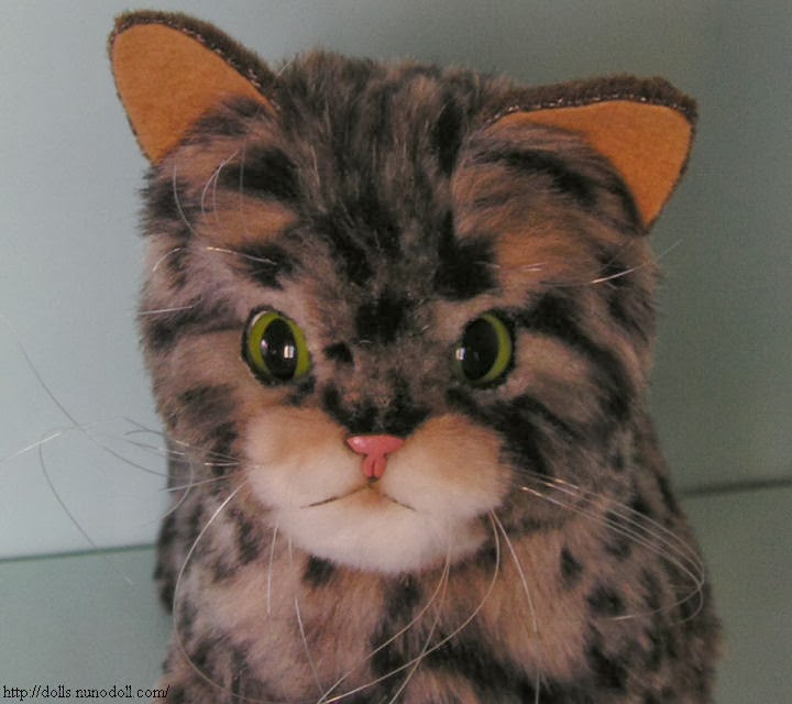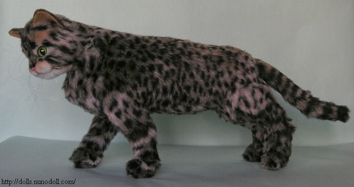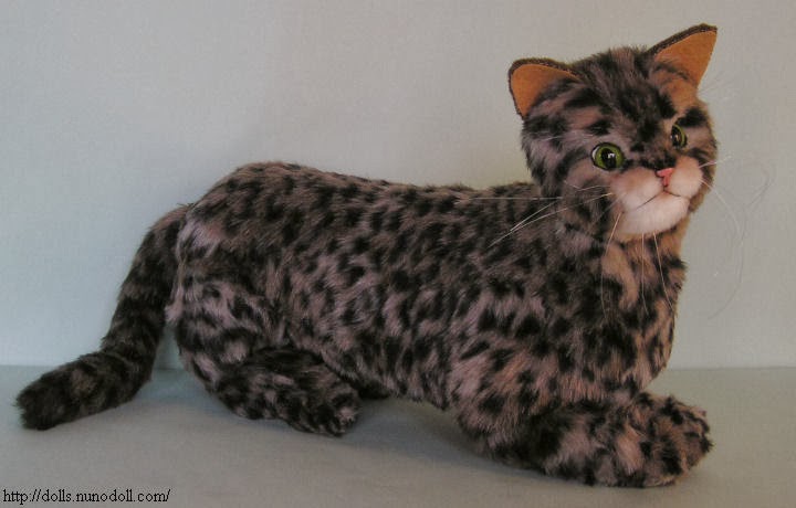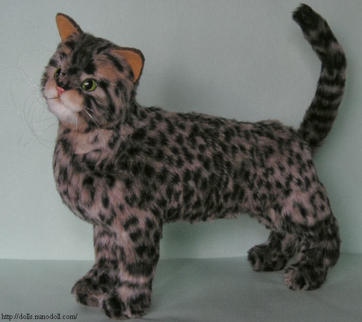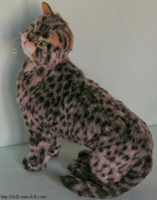 Gato manchado de Bengala. 32 cm de altura, 32 cm de longitud, y la cola es de 20 cm. ojos, bigotes de plástico de seguridad , la nariz es de arcilla. La piel es de peluche. Está articulado con alambres gruesos flexibles de la cabeza a la cola y extremidades . Estas articulaciones no son tan flexibles como el gato Bosque de Noruega .