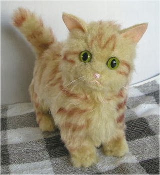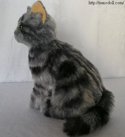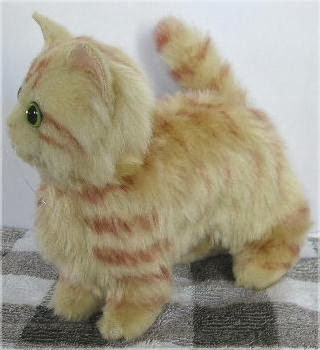 Gato gris ,el cual para simular el atigrado de su pelaje,fué pintado con un rotulador especial. 21 cm de altura. Tiene la articulación del cuello, por lo que puede dar vuelta a la cabeza. Los ojos y los bigotes de plástico. La nariz y la boca están bordados.