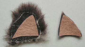 Pegue la oreja interior de fieltro en el interior de la tela de piel de peluche,doblar el sobrante y coser por la parte de arriba de la oreja, a lo que va a ser el interior del oido,menos en su base,donde va a ser cosida la oreja a la cresta de la cabeza.
