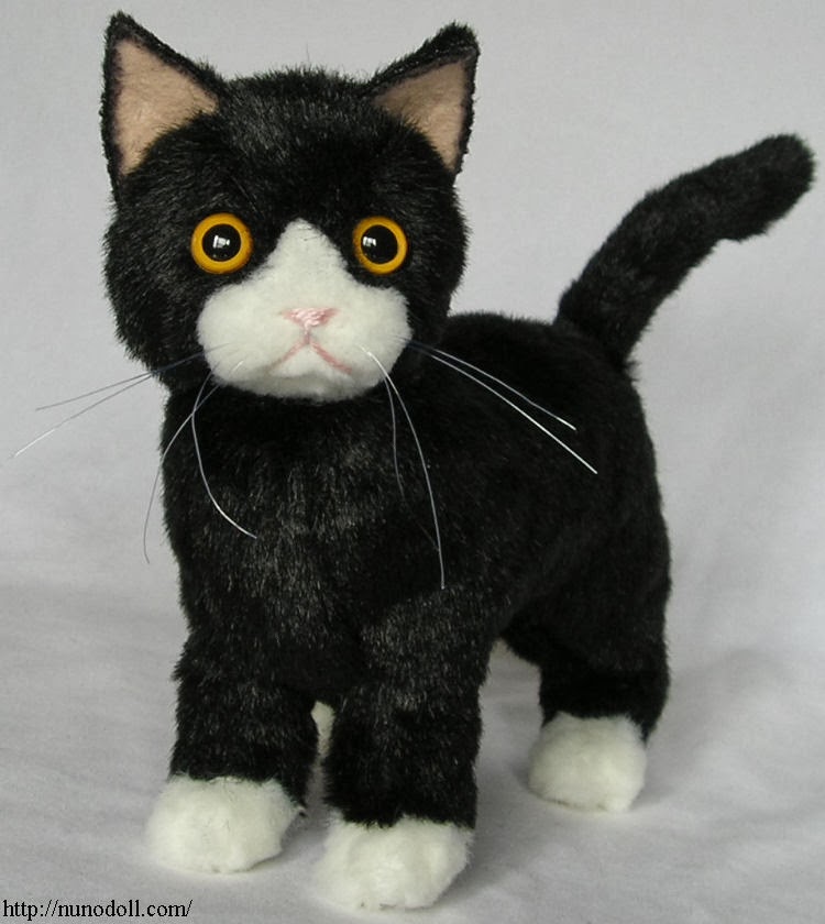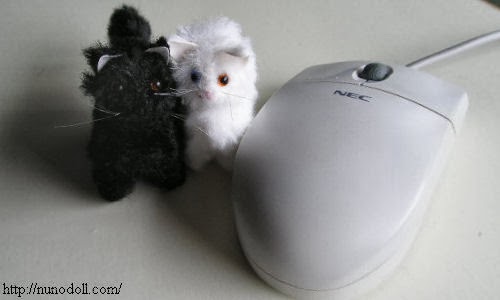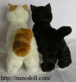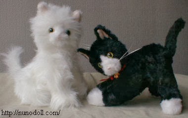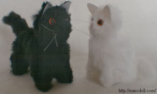 Gato negro y gato blanco. Cada altura es de casi 7 cm.Sus bigotes son hilos transparentes de nylon, ojos de vídrio y la nariz bordada.El gato blanco tiene los ojos dispares (azul y ámbar).