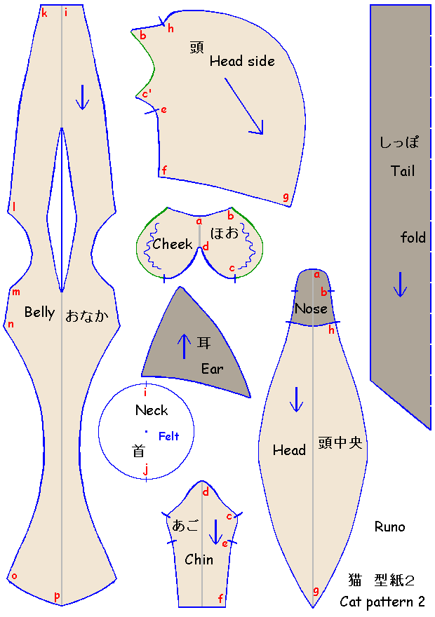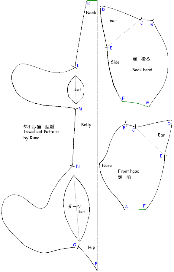 - Cosa de la línea de la cara y las orejas :F-E-D-C-B , del patrón- back head,osea cabeza por atrás, con las partes indicadas como : C-D-B-F, en el patrón front head o cabeza de frente que están en el patrón general : Cabeza y vientre.
