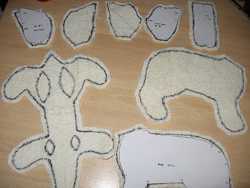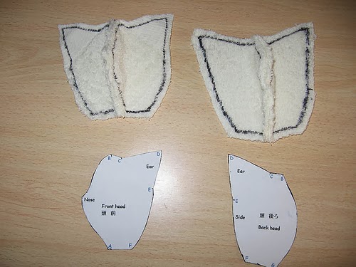 - Coser las bases de las orejas por donde indica el patrón : Cabeza y vientre,tanto donde pone- back head,como front head : C-E , para dar más realismo.