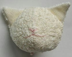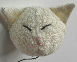 - Bordar la nariz, la boca y los bigotes con hilo grueso.( Si lo deseamos,en vez de bordar los bigotes y la naríz,podemos usar para los bigotes,hilo de pescar y para la naríz,o bien la podemos hacer con un botón triangular,comprar una de seguridad,como podemos hacer con los ojos o recortar un trocito de plástico,al cual haremos dos orifícios para coserlo como naríz,en la carita del gato ).