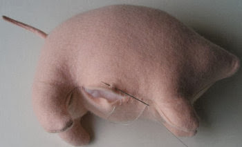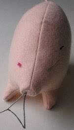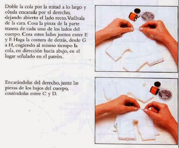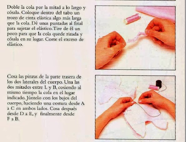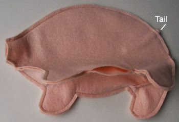 5. Coser el cuerpo,dejando una apertura en el vientre para poder rellenarlo.Meter dentro parte de la cola y coserla por dentro,para que cuando lo volvamos del derecho,no se vean las puntadas de la cola.