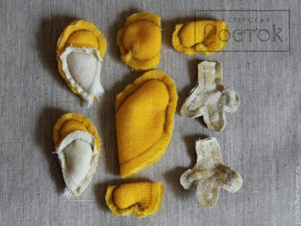 Vamos cosiendo las partes blancas con las amarillas por el lado del revés y cada pieza del cuerpo por separado,dejando en cada una un agujero para poder rellenarlas.