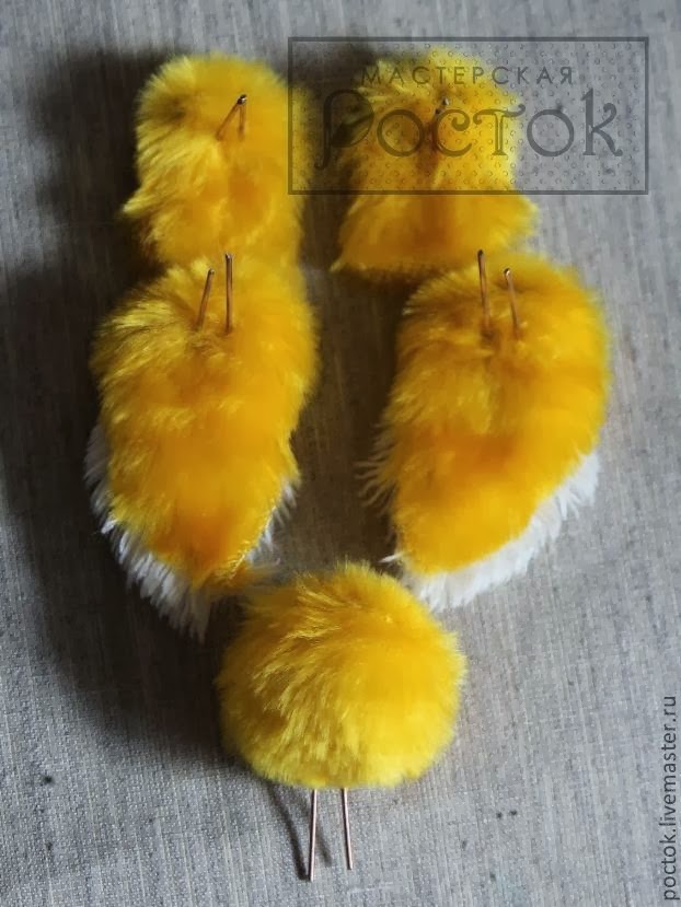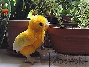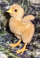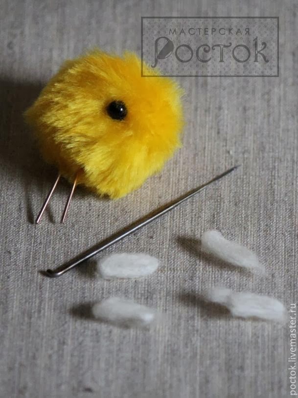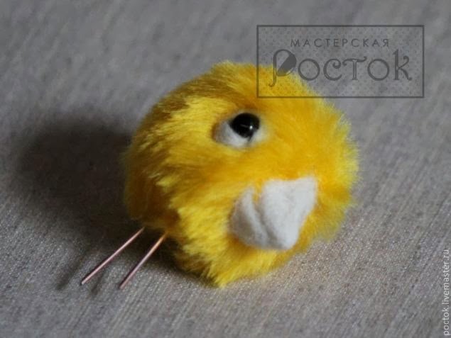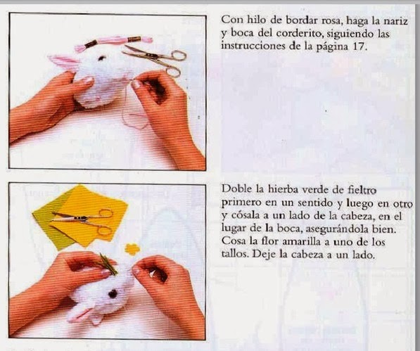 Al pico, ayudados por una foto de un pollito real,le haremos con unas puntadas las fosas nasales y de paso daremos volumen.Tras hacer el paso anterior,lo cosemos a la cabeza.
