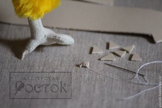 Cosemos con costura invisible las patas a los muslos y tomamos un pedazo de skay en color beige, cortado en triángulos semejantes en tamaño, coser por la mitad con costura invisible, tirando hacia abajo,imitando las uñas y coser a la pata.