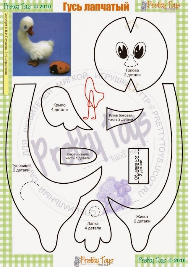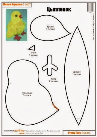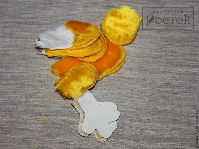 Fruncir el círculo del cuerpo y el de la cabeza por separado; rellenar ambas partes y cerrar el frunce. Unir la cabeza al cuerpo por la parte fruncida mediante unas puntadas escondidas. Pegar finalmente os ojos, el pico y las patas.