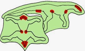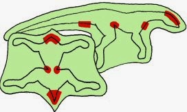 AHORA TENEMOS QUE TENER ATENCIÓN ESPECIAL MIENTRAS SE ESTÁ CON SU MÁQUINA DE COSER.Tanto a máquina ,como a mano, en primer lugar coser de A a D (si no lo ha hecho antes), dejando entre D y C sítio para el relleno. A continuación, de C a B (cola) y, finalmente, coser las piezas de B a A . Después de coser,se pueden quitar las puntadas de hilvanado en el caso de haberlas hecho. En la siguiente ilustración se etiqueta de rojo las zonas en las que hay que tener mucho cuidado y (en el caso de haber cosido a máquina) es preferible coserlos a mano:
