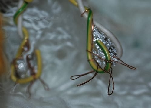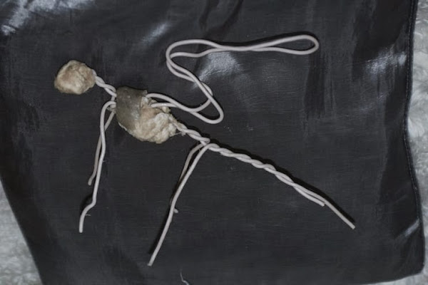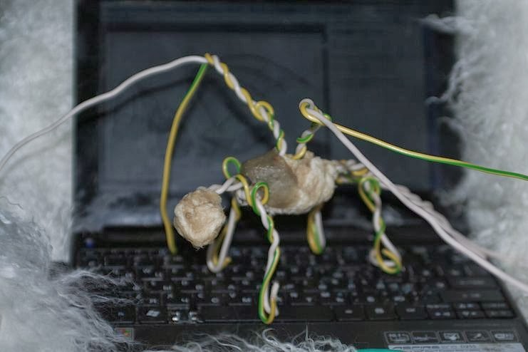 Al mismo tiempo, poner los dedos y enrollarlos,frotando de pegamento y envolviendo con hilo grueso, hasta dar el volumen deseado.Metemos el esqueleto en el cuerpo,rellenamos y cerramos menos por la parte de las alas.