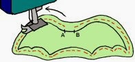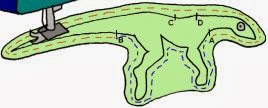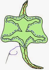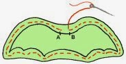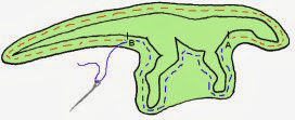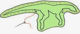 2 : Coser las piezas conectadas dejando parte de la cabeza para meter los ojos y parte de las alas abierta para el relleno, es decir,de la A a la B .Debemos usar hilo de diferente color para coser,según el color que vaya a tener definitivamente esa zona al terminar nuestro dragón.