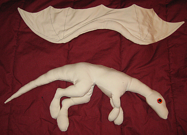 Coser el vientre al cuerpo,dejando una apertura para el relleno. Rellenar de fibra de poliéster, el cuerpo, las piernas y los picos,las placas óseas irán vacías.