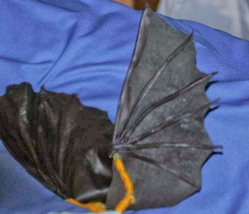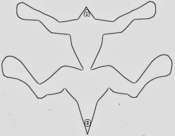 4 COSTURA: Si lo va a hacer a máquina,coser las alas con la máquina de coser a lo largo de los contornos de la A a la B, hasta los puntos y dejarlos sin coser,dejando una apertura: A continuación, coser lomo y el abdomen, junto a lo largo de sus contornos. Yo dejaría más sítio de apertura,haría por fuera con un lápiz unos dibujos en las alas ,como los que tienen los murciélagos (esqueleto) y ayudada por el dibujo,haría con alambre acerado y recubierto de cinta aislante un esqueleto del ala,el cual metería adentro ,cosería las alas hasta donde se indica,dejando su apertura y resaltaría el esqueleto,cosiendo alrededor de él,como las alas de los murciélagos.