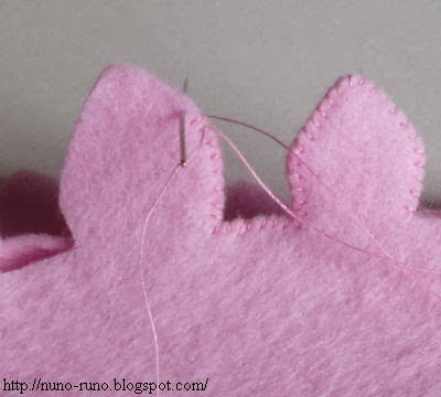 Con un lápiz,señalamos el sítio de ambos ojos y pinzamos con un alfiler,que traspase la tela,para no poner un ojo más arriba que otro.Hacer en ambas señalizaciones un pequeño agujero para que pase el vástago de los ojos de seguridad hasta obtener los ojos fijos en su posición.