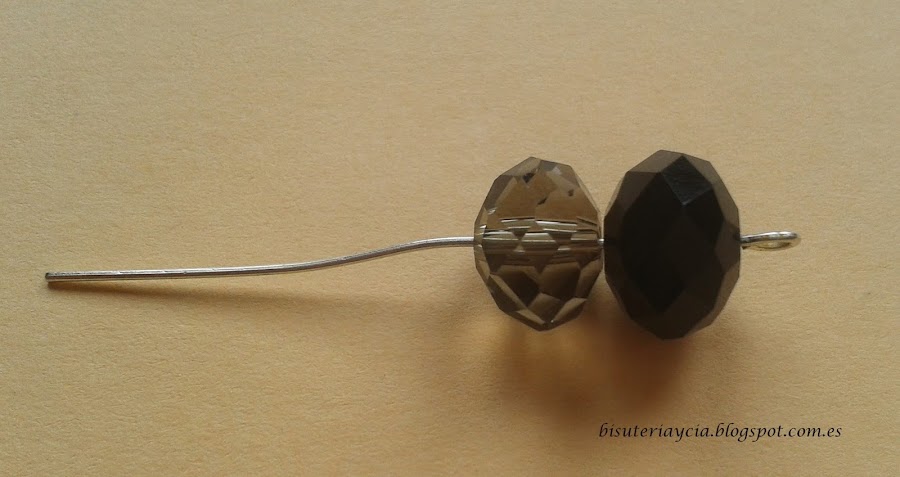Empecemos, paso uno, enfilar dos bolas facetadas de distinto color en el bastón para pendientes.