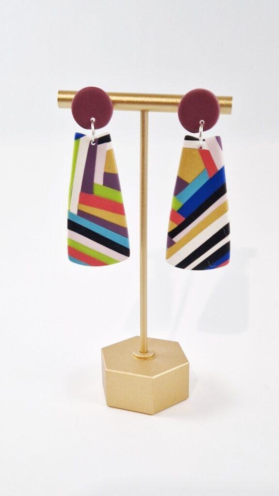 Aquí puedes ver cómo quedan estos pendientes tan originales y coloridos terminados:Esto me ha recordado a mi colgante log cabin, donde también apliqué a la arcilla una técnica del patchwork: