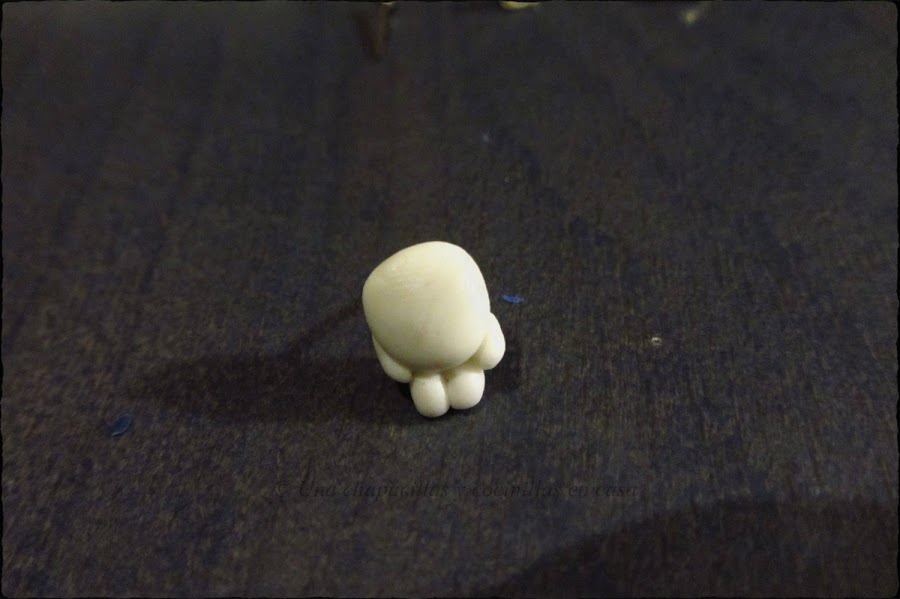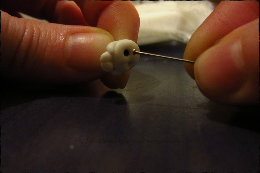 Para los ojos, primero hundí la cabeza de un alfiler un poco, puse una bolita pequeña de fimo negro y aplasté un poco de nuevo, hice un ojo mas grande que otro.