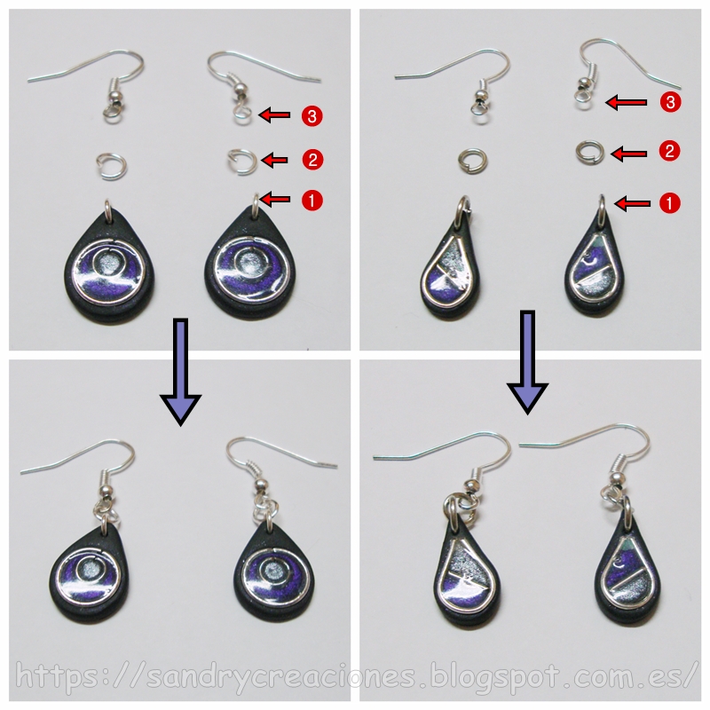 Primero colocaremos la anilla número 1 en cada una de las piezas y la cerraremos, luego pasaremos la anilla numero 2 a través de la anilla número 1 y antes de cerrar la anilla número 2 pasaremos la fornitura de pendiente, que tiene el número 3 en las imágenes, por ella y finalmente cerraremos la anilla número 2 dos completando el montaje del pendiente.