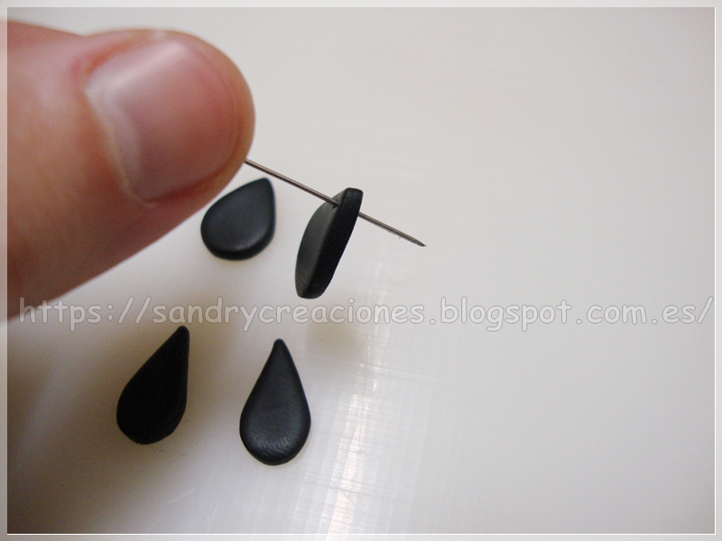 1- Amasaremos bien la pasta polimérica de color negro (1) y la aplanaremos con un rodillo hasta conseguir el grosor deseado (2), seguidamente con los moldes o cortapastas en forma de gota sacaremos cuatro piezas, dos de cada tipo, para realizar dos pares de pendientes (3 y 4).