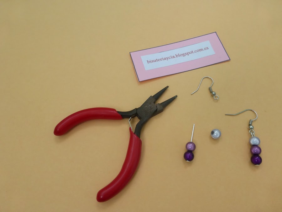 Para hacerlos solo tenemos que enfilar las tres bolitas en los bastones para pendientes y con el alicate de punta redonda doblaremos la parte superior del bastón que uniremos con el pendiente.