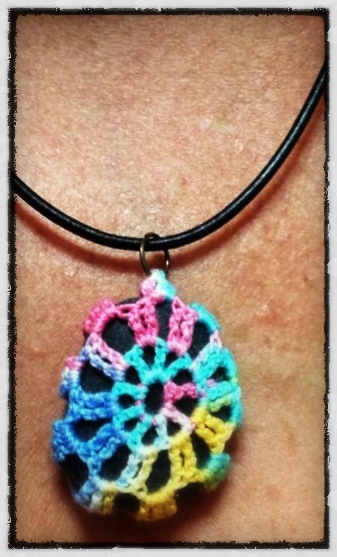 Para el colgante que lleva el mismo hilo no hay un patrón fijo, se trata simplemente de ir adaptándose a la forma de la piedra que, por otra parte, cuanto más plana sea mejor. En este Blog de The Purl Bee podeis encontrar un tutorial y muchas ideas superchulas. Aunque ella no la cubre completamente por detrás porque las utiliza como elemento decorativo, yo sí que lo hice porque la malla queda más resistente para poder colgarlas.