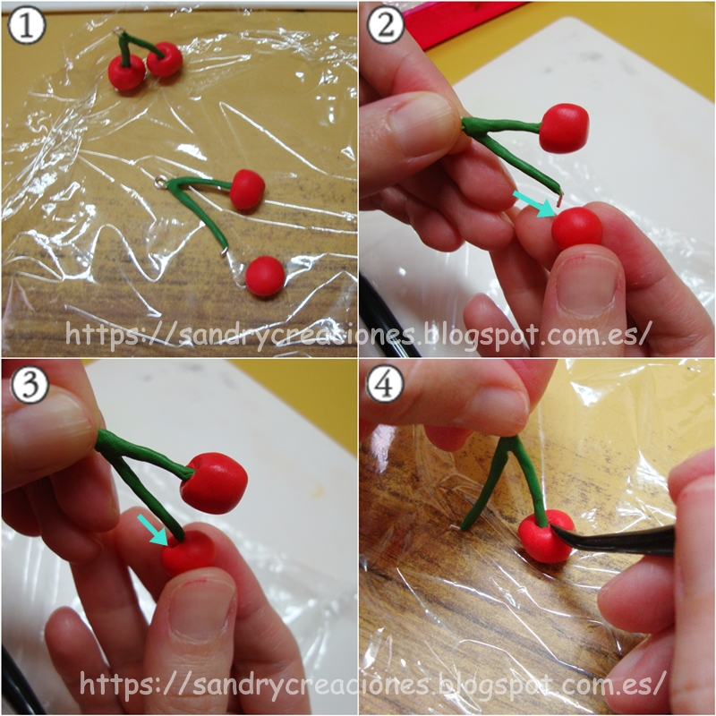 Una vez hecho esto haremos 6 bolitas más o menos iguales con pasta polimérica roja y las pondremos en cada uno de los extremos del "esqueleto" de las cerezas, de tal forma que la parte doblada en "L" quede dentro de las bolitas. Los extremos se podrían dejar rectos pero haciéndoles esta forma de "L" haremos más difícil que la bola se pueda caer una vez pasada la pasta polimérica por el horno, de esta forma nos ahorramos el pegamento