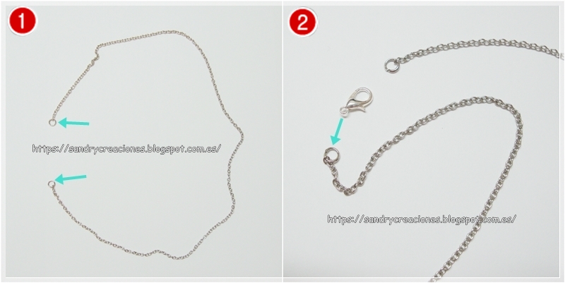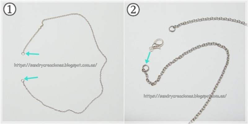 Para montar el colgante cogemos un trozo de cadena del tamaño que queramos de largo (en nuestro caso es tamaño gargantilla) y en cada uno de sus extremos ponemos una anilla pequeña (imagen 1) y en uno de los extremos ponemos un cierre mosquetón (imagen 2).