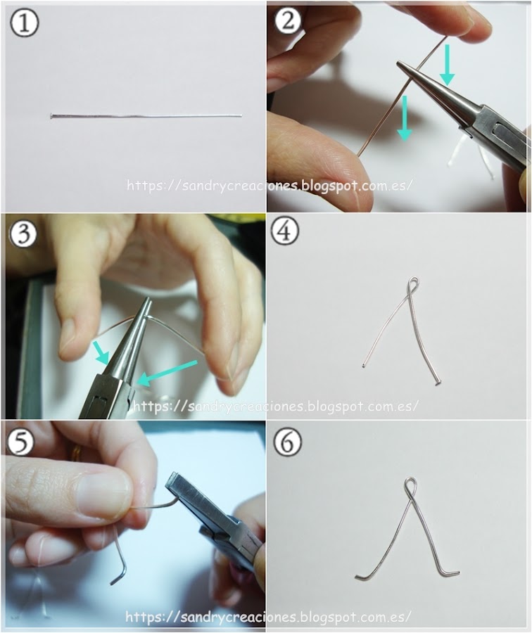 Para realizar las cerezas lo primero que haremos es coger una aguja de bisutería larga o un trozo de hilo metálico de unos 7 cm (imagen 1) y doblarla por la mitad con la ayuda de unos alicates redondos (imagen 2), una vez hecho esto, doblaremos cada uno de sus extremos hacia su lado opuesto sin quitar los alicates redondos (imagen 3) de tal forma que nos quede como una "e" con sus patas muy largas (imagen 4). Esa anilla formada al cruzar los extremos de la aguja de bisutería será dónde insertaremos más adelante la fornitura del pendiente y la anilla grande para el colgante.